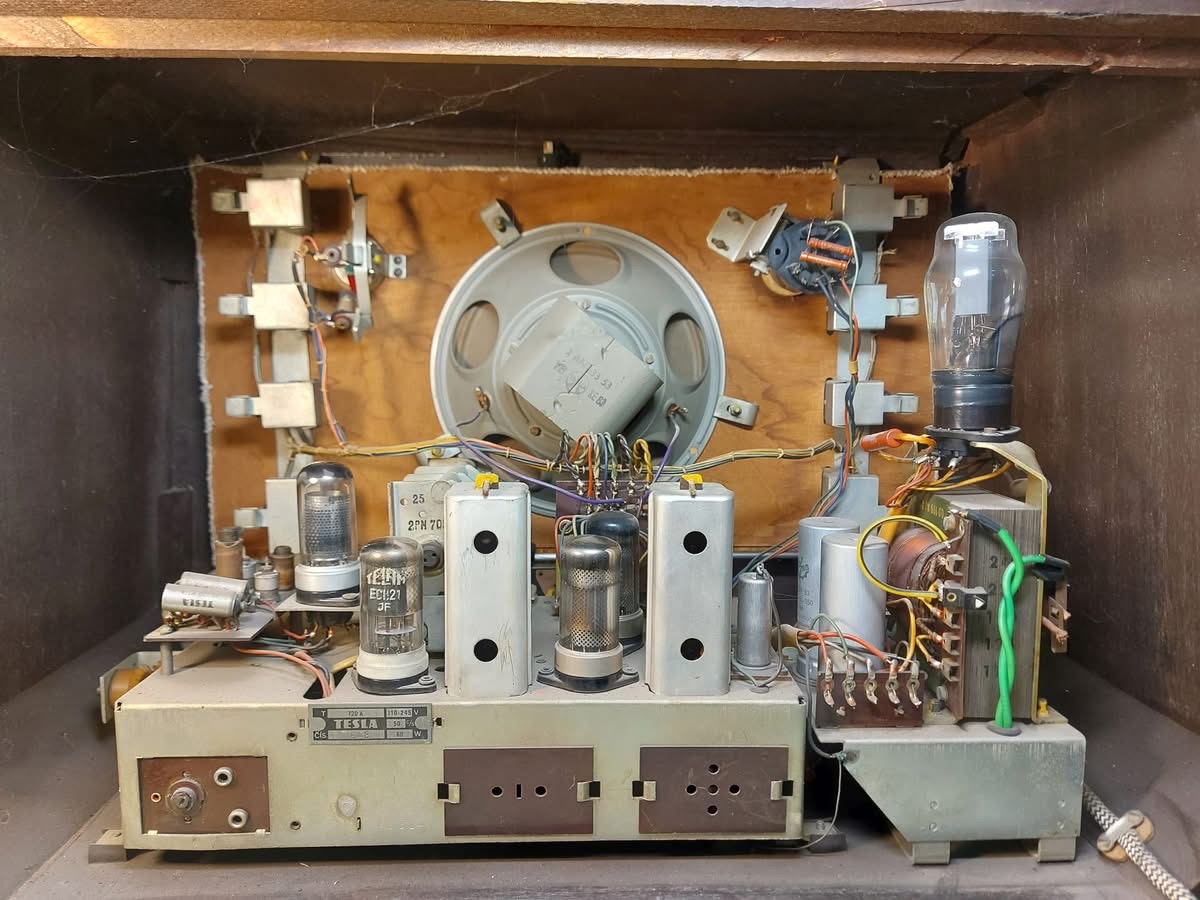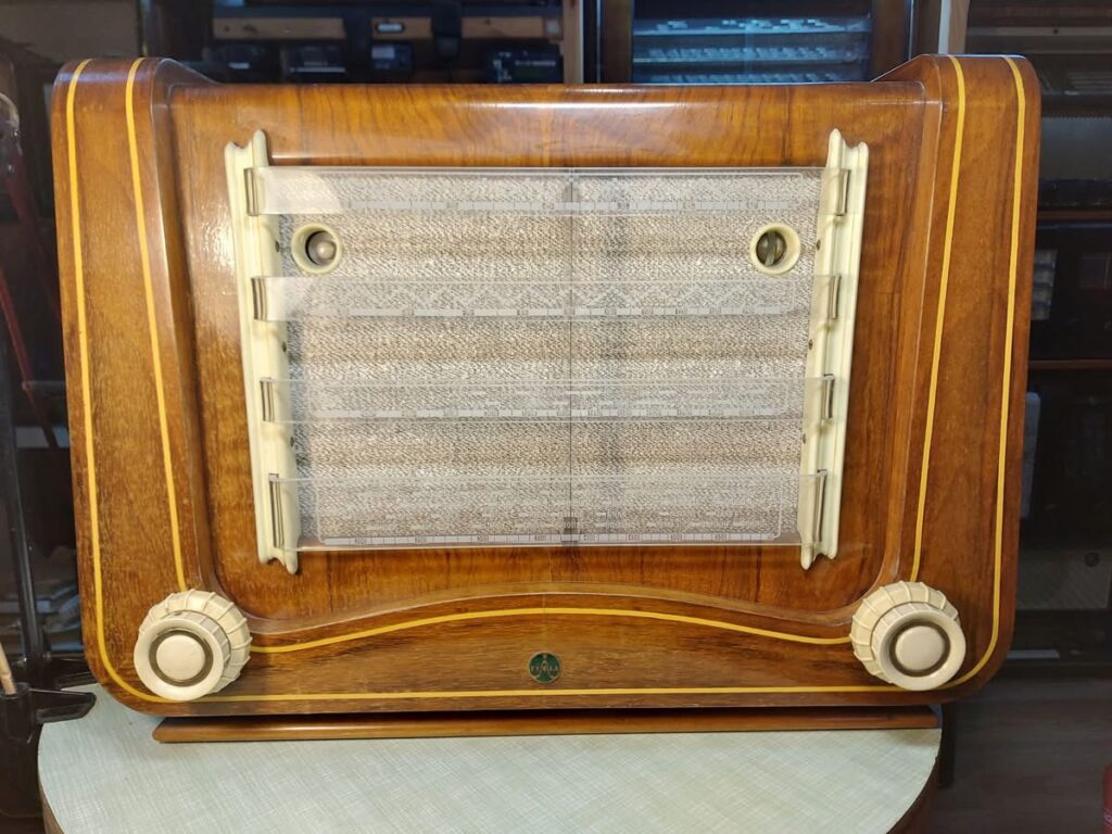 Pravý malý knoflík: vlnový přepínač – KV1, KV2, SV, DV, GRAMO standard, GRAMO mikro (zařazena navíc tlumivka pro úpravu zesílení a nf vazby)